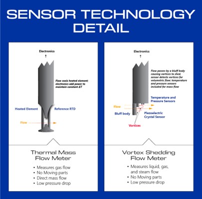 Comparison graphic highlighting thermal mass and vortex flow measurement technologies from Fox Thermal.